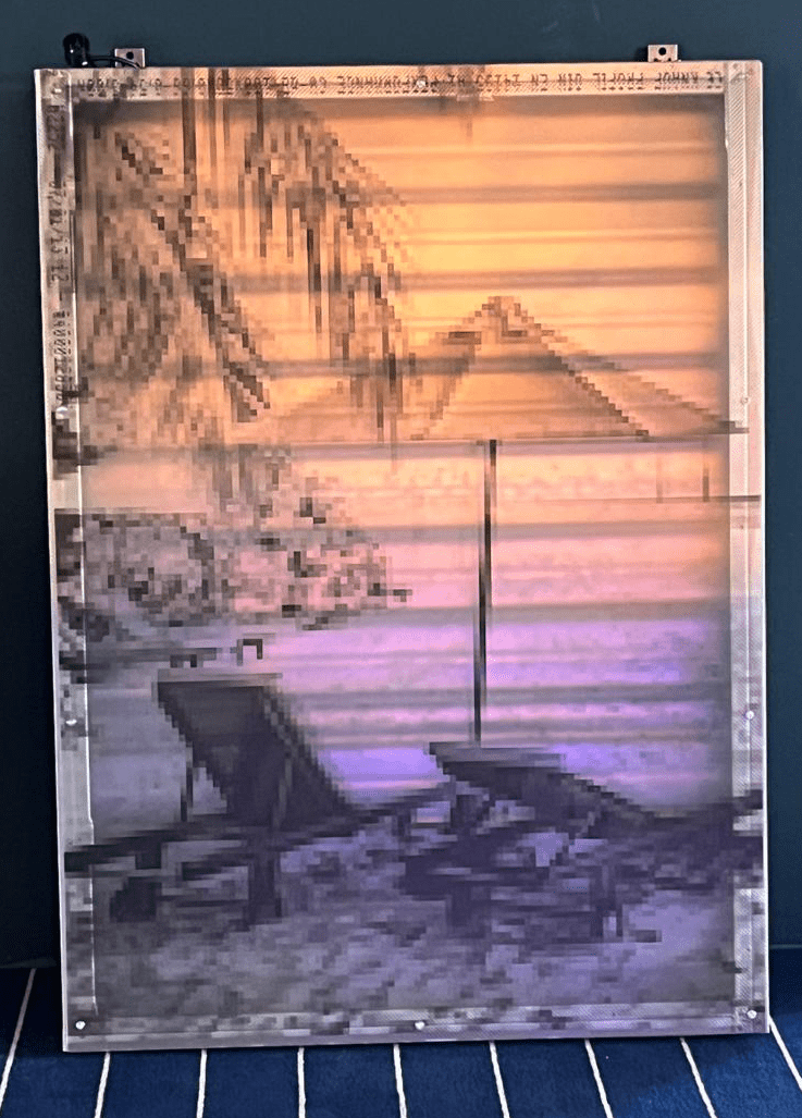 Betritt man die „Lido im Malkasten (Bar)“, steht man einem großer Bartresen gegenüber und ist umgeben von dunkelblau gestrichenen Wänden. Der Raum wird nur indirekt beleuchtet. Paul Schwer platziert Leuchtkästen an den Wänden, die ebenfalls nicht gleichmäßig beleuchtet sind und zitiert damit die diffuse Lichtstimmung – und zugleich seine eigene Ausstellung im Rohbau eines Ladenlokals in der Shoppingmall des Düsseldorfer Flughafens 2024. Auf den Folien in den Leuchtkästen sind – wenn auch stark verpixelt – Motive von Badenden zu sehen, man kann einen Sonnenschirm identifizieren sowie Liegenstühle und zwei Personen, die sich küssen. Motive, bei denen man unwillkürlich an Sonne, Strand und Meer denken muss. An Cocktails an einer Bar in der Abendsonne, am Lido in Italien vielleicht? Für Paul Schwer ergab sich eine Assoziationskette, die keine anderen Werke für diese Ausstellung in Frage kommen ließen. Es sind Sehnsuchtsmotive. Es ist „Kiss and Fly“. Doch sind seine Leuchtkästen keine Reklametafeln für einen Pauschalurlaub. Ihre Korpusse sind roh belassen, bestehen aus U-Profilen aus dem Trockenbau. In sie eingesetzt sind Siebdrucke, die stark verpixelt sind, und transluzente Backlightfolien. Bei den „Bildern“ handelt es sich um austarierte Farbkompositionen, in denen sich Paul Schwer mit den Themen Farbe, Licht und Transparenz auseinandersetzt.